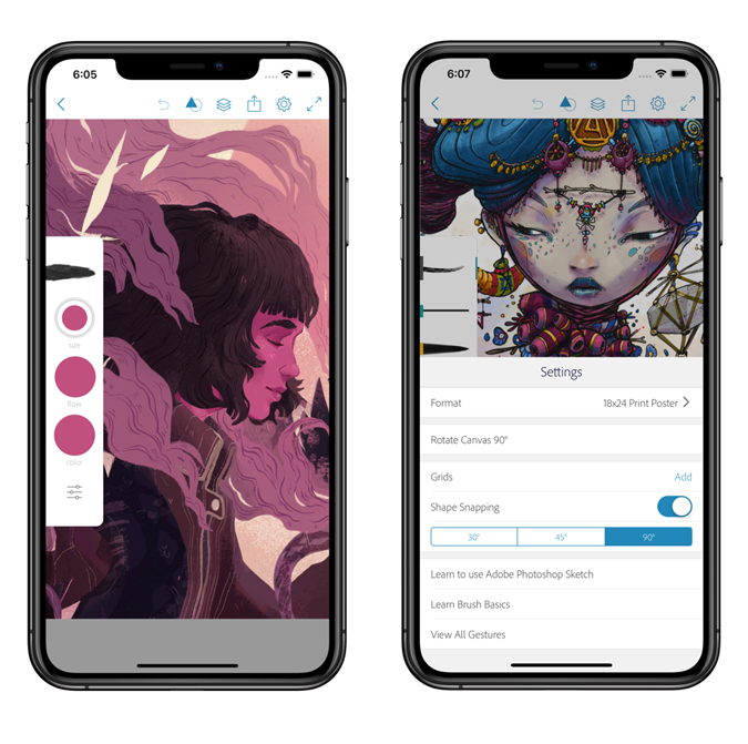 انت الان تعلم ان هذا التطبيق ليس للاطفال و ربما ليس للمبتدئين ايضا فمعرفتك السابقه لبرنامج فوتوشوب ستخبرك بمدى تعقيد و براعة الادوات الموجوده التي ستساعدك على رسومات افضل حيث تحصل على 24 فرشاة مدمجة قابله للتعديل و لديك الكثير من الأدوات وخيارات التخصيص و كذلك يمكنك