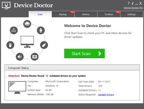 برنامج Device Doctor هو برنامج مجاني مجاني آخر رائع أيضاً خصوصا لنظام ويندوز 10، إنه ببساطة يقوم بعمل المهمه بشكل أساسي جداً وبمنتهى البساطة والهدوء، عبر عبارة سوف تراها أمامك عند فتح البرنامج تقول لك إبدأ المسح أو Start Scan يمكنك الضغط عليها فور بدء تشغيل البرنامج ويقوم بعد ذلك بعمل تجربة بحث إن كان هناك جديد في التحديثات الخاصة بالتعريفات المتعلقة بحاسبوك أم لا.
