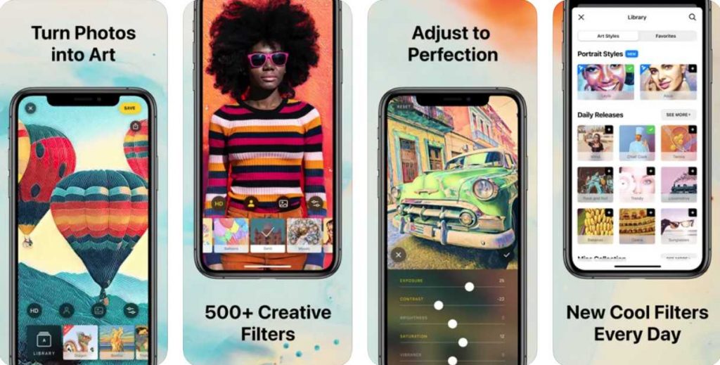 يستخدم التطبيق في التعديل على الصور بشكل رائع يحول الصور الى لوحات فنية من خلال اضافة التأثيرات للصور و يحتوي التطبيق على اكثر من 300 نمط للاستخدام و ذلك ببساطه من خلال التقاط الصورة و تحديدها ثم اختيار النمط المناسب حتى تصبح الصورة رائعه فهو يعمل على تحويل صورتك في غضون ثوانٍ قليلة إلى صورة مصغرة لبيكاسو أو مونش و ذلك من خلال الذكاء الاصطناعي الذي يعمل على الربط بين الصورة و اسلوب العمل الفني مما يجعله من تطبيقات الايفون المفيدة .