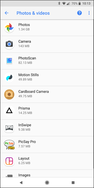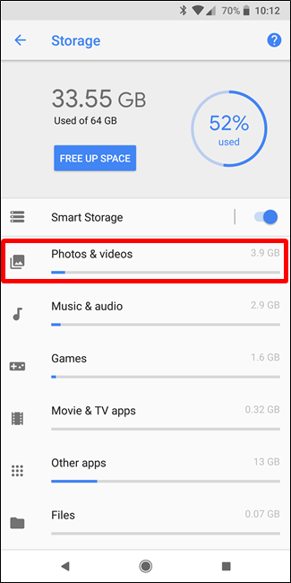 الآن سوف تجد أمامك تحليل مفصل عن مساحة التخزين في هاتفك، سواء لوحدة التخزين الداخلية، أو بطاقة SD في حال كنت تستخدمها، وسوف تجد تصنيفات متنوعة مثل الصور ومقاطع الفيديو والملفات الصوتية والمستندات والتطبيقات النظام وغير ذلك، وسوف يظهر بجوار كل منها المساحة التي تشغلها في هاتفك، ويمكنك التمرير لأسفل لرؤية الملفات الكبيرة أو الملفات التي لم تستخدمها لفترة طويلة، والتي يمكنك إزالتها لتفريغ بعض المساحة في هاتفك.