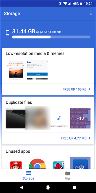 إن وجود الكثير من الملفات كبيرة الحجم أو الملفات غير الهامة على هاتفك هو أحد الأسباب الرئيسية التي تؤدي إلى إمتلاء مساحة الأندرويد، ولهذا يمكن لحذف هذه الملفات أو حتى الإحتفاظ بها في مكان آخر أن يساعدك على حل مشكلة امتلاء مساحة الهاتف بشكل فعال، ومن أجل معرفة هذه الملفات يمكنك استخدام تطبيق Files Go الرائع جدًا وهو أحد التطبيقات المقدمة من شركة جوجل لمستخدمي الأندرويد لمساعدتهم على إدارة مساحة التخزين بشكل بسيط وسهل جدًا، وإليك فيما يلي طريقة استخدام التطبيق: