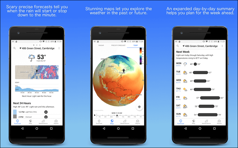 يعد تطبيق Dark Sky من أفضل تطبيقات الطقس والوقعات بالأحوال الجوية ، يمتلك التطبيق مميزات عدة ،