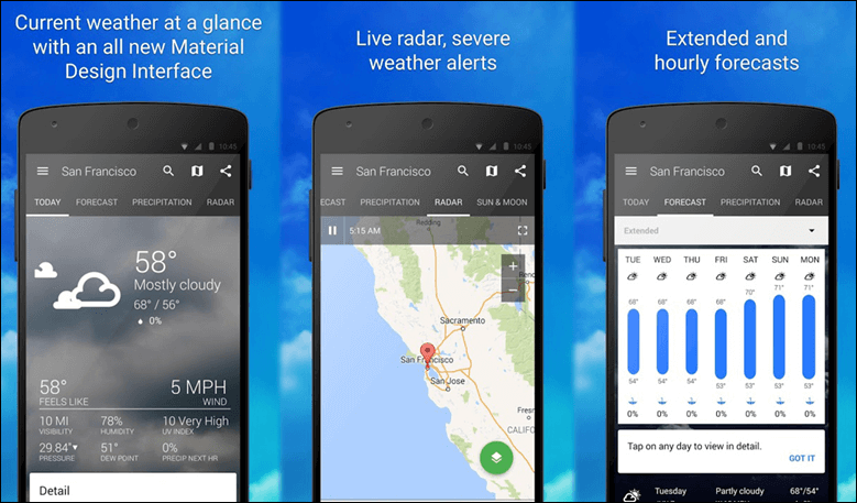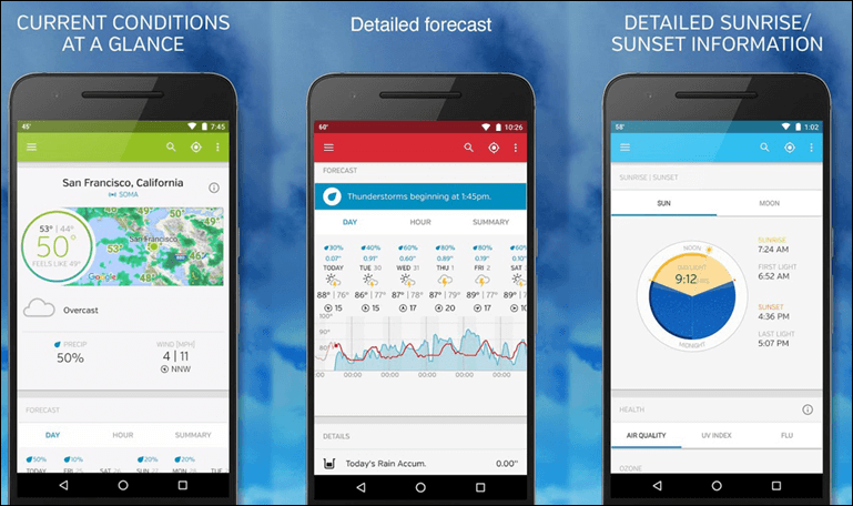أفضل المصادر لمتابعة التغيرات الجوية حيث تم برمجة تطبيق Weather Underground من قبل شركة يبلغ عدد محطات الطقس بداخلها 250.00 محطة حيث يعد التطبيق جديرا بالثقة ، يعد التطبيق مصدرا موثوق بة لدرجة كبيرة لدي العديد من الشركات الكبري لمعرفة كيف تسر الأحوال الجوية خلال اليوم لإتخاذ الإحتياطات المناسبة ، يقدم التطبيق نشرة عن الأحوال الجوية كل مدة صغير لمعرفة الطقس ، يقدم التطبيق أيضا المعلومتا مهما كانت غير هامة للطقس ، يحتوي التطبيق علي تطبيق مصغر يمكن وضعة علي الشاشة الرئيسة .التطبيق مجاني باكامل ،يمتلك الإعلانات يتوجب عليك دفع 2 دولار لإزالتها .