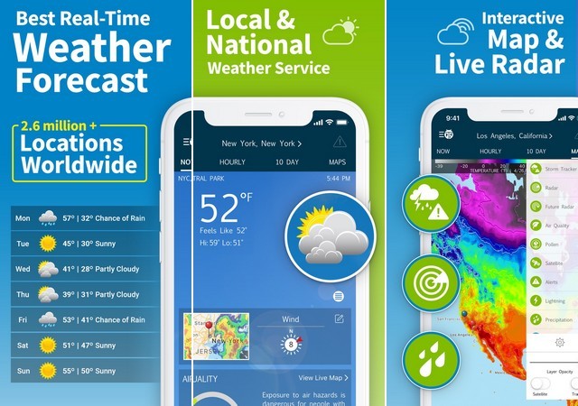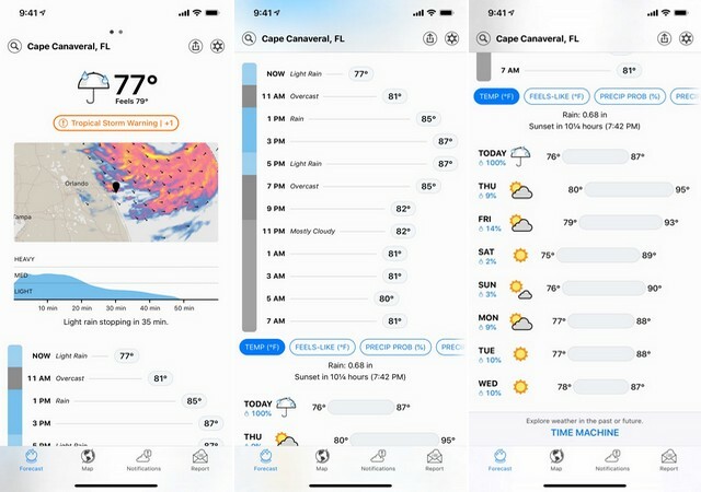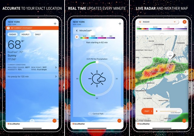 يعتبر AccuWeather من افضل تطبيقات الطقس للايفون 2020 و يعتبر من اكثر التطبيقات استخداما نظرا لدقته و سهولة واجهة الاستخدام الخاصه به فهو يوفر المعلومات الكافيه عن الطقس باكثر من 100 لغه و يمكنك من خلاله معرفة توقيت هطول الامطار و مدة هطولها و يخبرك التطبيق في حال وجود عاصفه قريبه منك و موعدها و اكثر من ذلك و هو مجاني .