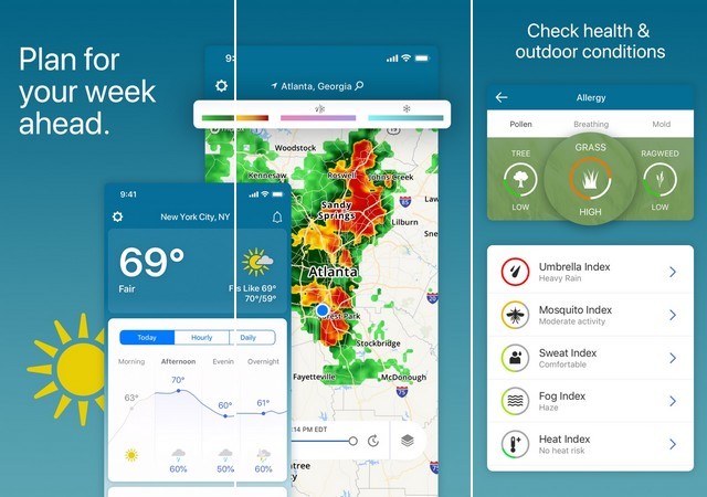 تطبيق اخر من افضل تطبيقات الطقس للايفون 2020 و هو The Weather Channel و من التطبيقات التي لها شعبيه كبيره على متجر ابل فهو يوفر لك تحديث حالة الطقس اولا بأول بتوقيت البلد التي تسكنها و يعرض تغيرات الطقس كل ساعه و كل يوم و يوفر التطبيق أيضًا تنبيهات الحساسية عالية المخاطر و الاستشارات الطبية التي لن تجدها في معظم تطبيقات الطقس الاخرى كل هذا بالاضافه الى معلومات تفصيليه عن حالة الطقس و غيرها الكثير تجدها على هذا التطبيق الرائع و هو مجاني و لكن يأتي مع الاعلانات و يمكنك شراء عناصر اضافيه من داخل التطبيق و التخلص من الاعلانات و سيكلفك ذلك 4 دولار اميركي .