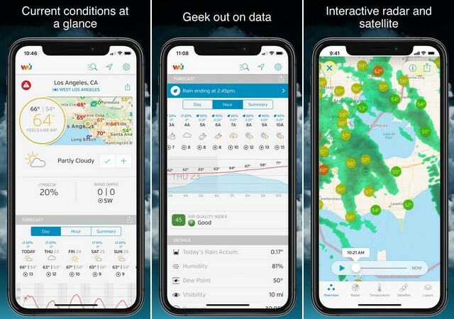 من ضمن التطبيقات المميزه Weather Underground و يعتبر من افضل تطبيقات الطقس للايفون 2020 فهو يوفر لك تحديثات الطقس حسب توقيتك المحلي في الساعه الحاليه و لمدة 10 ايام قادمه و يوفر بيانات مثل جودة الهواء و مؤشر الأشعة فوق البنفسجية و تفشي الإنفلونزا المحلية و شروق الشمس و غروبها بالاضافه الى أكثر من 270،000 محطة طقس شخصية حول العالم و يأتي التطبيق مع خرائط الحراره و تراكم الامطار و يمكن تحويله للوضع الداكن و هو تطبيق مجاني .