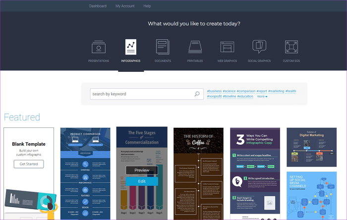 دعونا نبدأ بهذا الموقع الرائع جدًا، فهو عبارة عن أداة لعمل صور إنفوجرافيك، ويحتوي الموقع على الكثير من قوالب الإنفوجرافيك والتي يمكنك الإختيار من بينها، كما أن الموقع به الكثير من الأيقونات والصور الرمزية الجميلة جدًا والتي تساعدك على الحصول على تصميم إنفوجرافيك جميل وجذاب.