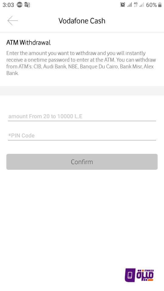 - يمكنك السحب من 20 جنيها اصغر قيمه الى 10000 جنيه اكبر قيمه فقم بكتابة ما تريد سحبه في الخانه الاولي و الخانه الثانيه اكتب الكود السري “PIN” الخاص بك و اضغط على تأكيد Confirm و ستاتي رساله تحتوي على بعض البيانات منها الرقم السري الذي سوف تقوم بادخاله عند السحب .