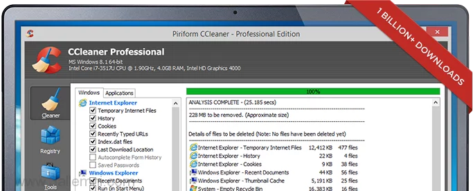 اذا كنت تعاني من بطيء جهازك والويندوز الخاص بك فبرنامج CCleaner يقوم بتنظيف الويندوز وتسريع الكومبيوترو اللاب توب عن طريق حذف الملفات التي تتراكم علي الويندوز وليس لها فائده وبه ايضا خاصية حذف الكوكيز والهيستوري من المتصفحات وايضا يقوم بتنظيف ملفات الريجستري كل هذا يساعد علي تنظيف الويندوز من الملفات اللتي ليس لها قيمه ، البرنامج تم تحميله اكثر من مليار مره مما يعكس مدى نجاح هذا البرنامج و حاصل علي العديد من الجوائز