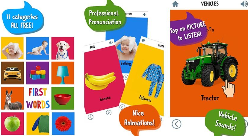 تطبيق First Words for Baby : يعد كأفضل التطبيقات المميزة والمحببة للأطفال وذالك لما يقدمة من مميزات كالتعدد من أنواع اللعب والأصوات المختلفة من الطيور والحيوانات والمركبات وأيضا الألوان والطعام حتي يقدر الطفل علي التفرقة بين أنواع الأكل كالخبز واللحوم والتفرقة بين أصوات الحيوانات والطيور والألوان ، كما يمتلك ميزة أخري وهي البطاقات التعليمية التي تظهر الكلمة ونطقها أيضا حتي يستطيع الطفل نطق الكلمات بشكل صحيح ، أيضا يحتوي التطبيق علي الإعلانات يمكنك التخلص منها بدفع 2 دولار .