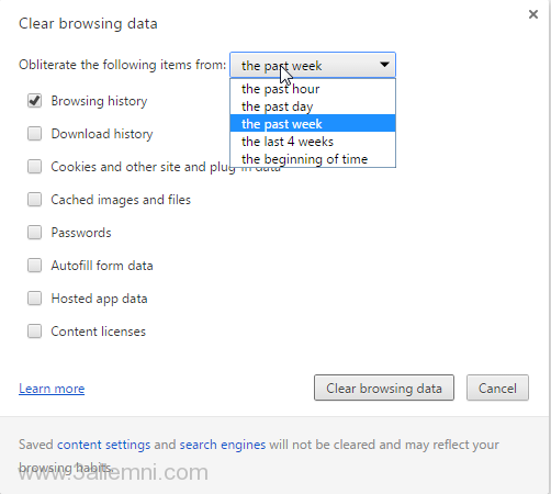 • الخطوه الثالثه : بعدما تقوم بالضغط على “Clear Browsing History” لكى تقوم بمسح كل الهيستورى الخاصه بمتصفح جوجل كروم سوف تفتح لك نافذه جديده لكى تقوم باختيار المده التى تريد ان تقوم بحذف الهيستورى منها حيث امكانيه ان تقوم بحذف الهيستورى الخاصه بالساعه الماضيه او باليوم الماضى او بالاسبوع الماضى او منذ بدايه تثبيت المتصفح على الكمبيوتر و ايضا ستجد امكانيه حذف هيستورى الداونلود و الكاش و غيره من الاشياء لذا عليك ان تقوم باختيار “Browsing History” اذا كنت تريد حذف الهيستورى فقط