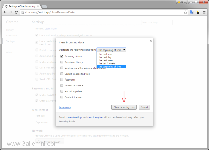• الخطوه الرابعه : بعدما تقوم باختيار المده التى تريد ان تقوم بحذف الهيستورى من جوجل كروم ثو تقوم بالضغط على “Clear Browsing Data” المتواجده اسفل النافذه الخاصه بحذف الهيستورى من المتصفح