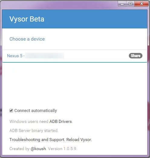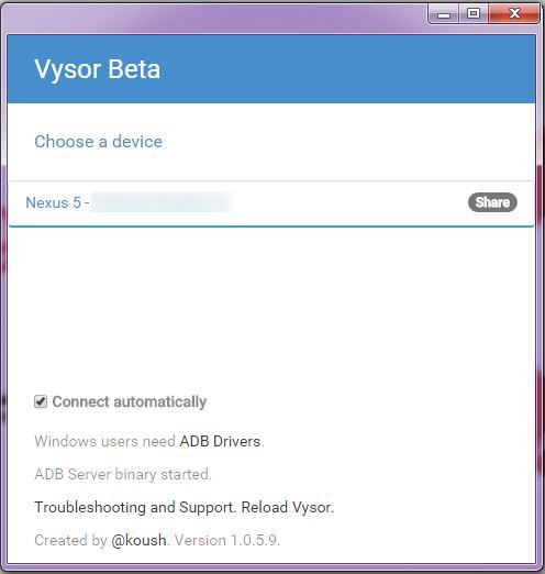 8- نقوم بفتح تطبيق Vysor و سوف نجد أن الهاتف قد تعرّف عليه التطبيق تلقائياً.