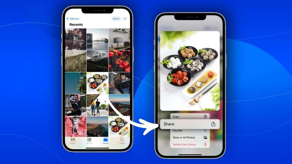 1- قم أولاً بتحديد الصورة التى ترغب فى تحويلها إلى بى دى أف وفتحها فى تطبيق الصور على هاتفك الأيفون أو الأيباد ومن ثم قمت بالضغط على خيار مشاركة Share أسفل أتجاه اليسار للصورة .