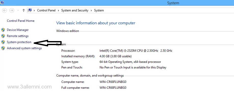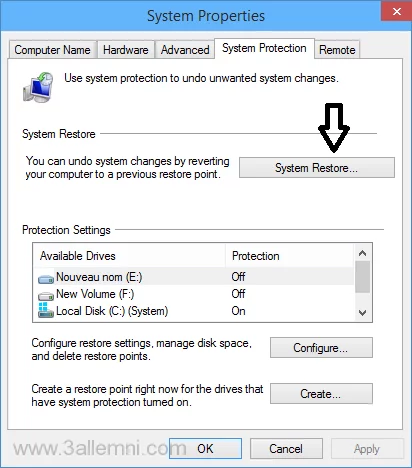 لكى نقوم بعمل Restore او استعاده النظام  نقوم بالضغط على Start و بعد ذلك System قم نختار Restore System او نقوم بالضغط على Start و نقوم بكتابه Restore لتظهر Restore System نضغط عليها ستظهر لك نافذه جديده اذا كنت تريد ان تقوم بعمل نقطه لاستعاد النظام و لكن ليس هذا ما نود ان نقوم بفعله فسوف نقوم بالضغط على System Protection مثل الموضح بالصوره