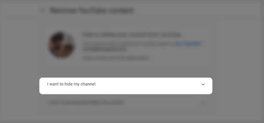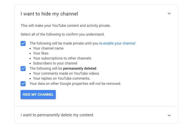 بعد ذلك سيوضح لك جوجل ماذا سيحدث حال اخفائك للقناة ثم اختر “I want to hide my channel” ثم اضغط على اخفاء المحتوى الخاص بي “HIDE MY CONTENT” و قد يحتاج جوجل بعض الوقت حتى يستطيع حذف كل تعليقاتك على يوتيوب .