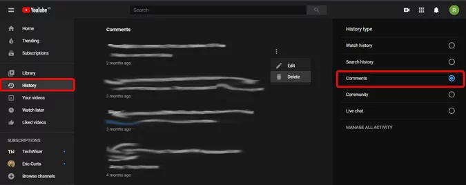 يمكنك مشاهدة كافة تعليقاتك مرتبة من الاقدم الى الاحدث و يمكنك ايضا اختيار التعليق الذي تريد حذفه من خلال الضغط على الثلاث نقاط بجانب كل تعليق و اختيار تعديل “Edit” او حذف “Delete” و بهذه الطريقة يمكنك حذف كل تعليقاتك على يوتيوب بسهولة .