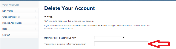 - الخطوة الخامسة: سيطلب منك التطبيق أيضاً إعادة كتابة حسابك المراد حذفه مرة أخرى، وذلك في المربع المجاور لكلمة “To continue, Please Re-enter your password”.