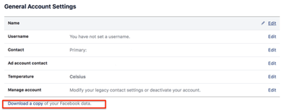 - فى اسفل صفحه الاعدادات الخاصه بحسابك سوف تجد اختيارك يمكن من تحميل نسخه من بيانات حسابك على الفيسبوك بشكل مباشر .