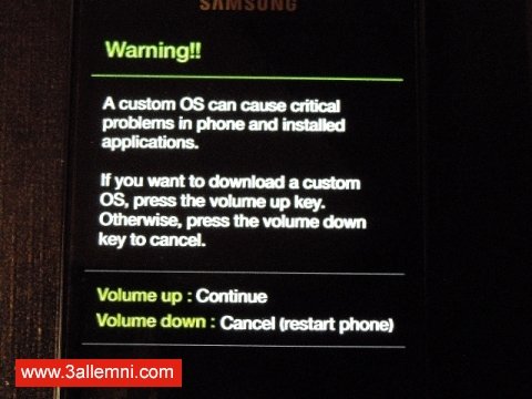 - عند الدخول الى وضع التحميل “Download Mode” سوف تجد رساله تعلمك ان سوف تستطيع الاستكمال عن طريق الضغط على زر رفع الصوت Volume Up .. سوف تقوم بالضغط عليه