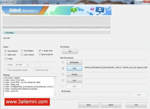 - بعد ذلك سوف تختار “PDA” المتواجده فى البرنامج و منها تقوم باختيار الروم الخاص بالجهاز و الذى قمت بتحميله فى الخطوات السابقه و ايضا تقوم باختيار “Auto Reboot” و “F.Reset Time” من “Options” المتواجده فى يسار البرنامج