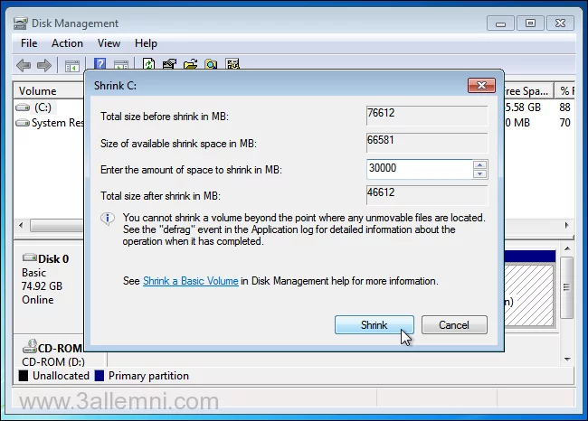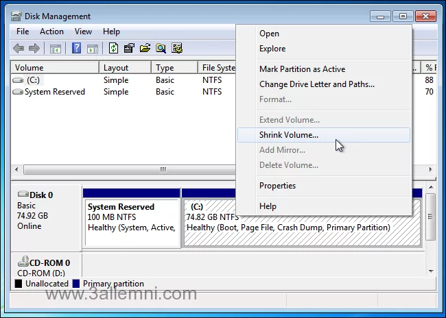 عد ذلك قم بتحديد البارتيشن المتواجد عليه ويندوز 7 او ويندوز 8 و اضغط علىه بزر الماوس الايمن و اختار Shrink Volume لتخصص مساحه منه لويندوز 10 مثل الموضح بالصوره .