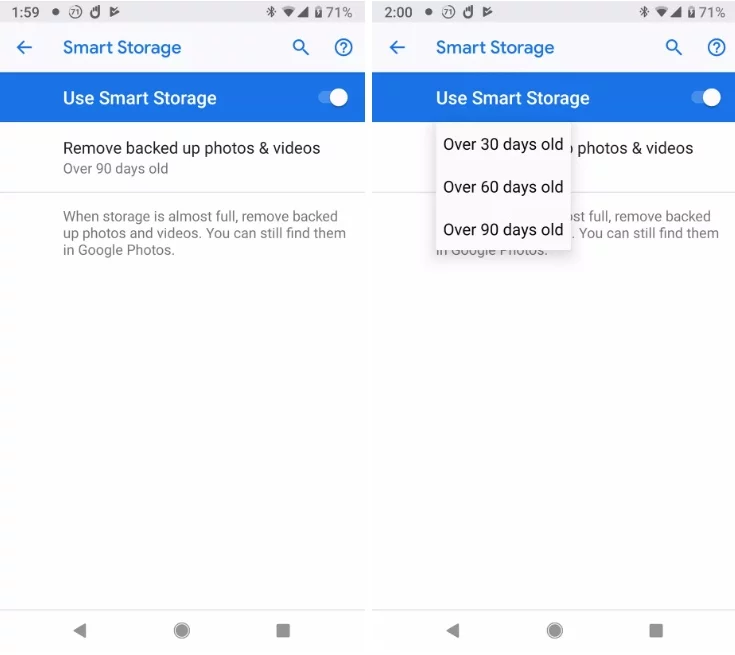 هناك ميزة تسمى التخزين الذكي “Smart Storage”  و التي تمنح هاتفك إذنًا لإزالة الصور الاحتياطية تلقائيًا بعد 30 أو 60 أو 90 يومًا سيؤدي أيضًا إلى إزالة الصور و مقاطع الفيديو التي تم نسخها احتياطيًا تلقائيًا إذا كانت مساحة التخزين لديك ممتلئة تقريبًا.