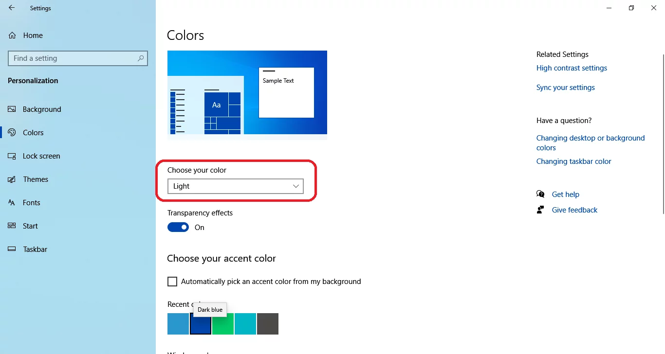 ستجد أمامك مربع يسمح لك بعدة إختيار تحت عنوان Choose your color، به وضعان لواجهة ال Desktop الخاصة بنظام الويندوز وضع Light وهو الوضع التقليدي الذي يعطي لك اللون الأبيض الفاتح الزاهي، والوضع الآخر وهو Dark المعروف بإسم الوضع المظلم أو ال Dark Mode، قم بإختيارة لتفعيل الوضع المظلم على جهازك الكمبيوتر أو اللابتوب الخاص بك.