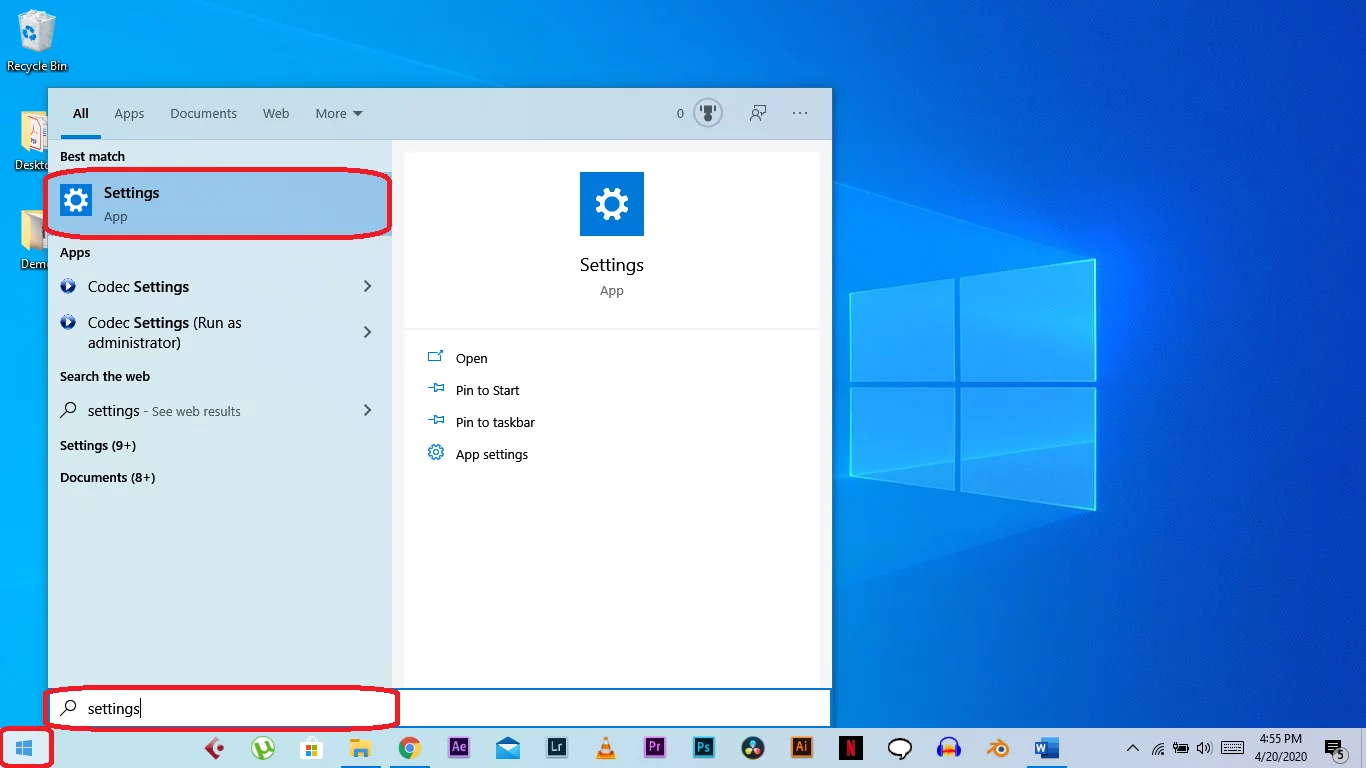 قم بفتح قائمة إبدأ من خلال الرمز الموجود أسفل يسار شاشة الويندوز، أو عن طريق الضغط على زر الويندوز المتواجد على لوحة المفاتيح لديك في اللابتوب أو جهاز الكمبيوتر الخاص بك. قم بكتابة الإعدادات Settings وسيظهر لك تطبيق الإعدادات قم بالضغط عليه.