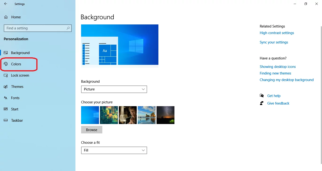 قم بالضغط على قائمة الألوان Colors الموجوده بداخل إعدادات التخصيص Personalization للإستمرار.