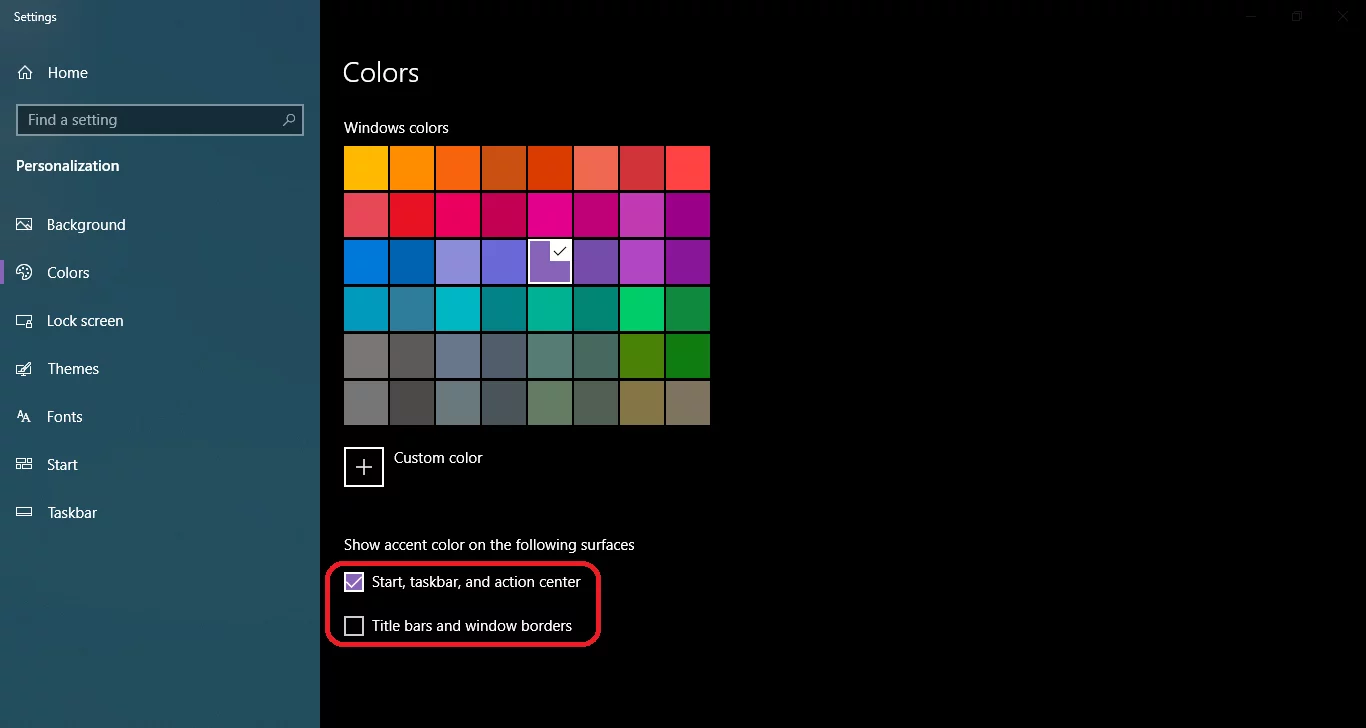 يمكنك أيضاً تفعيل هذا الخيار Show accent color on the following surfaces، ليسمح لك بإتباع اللون على كافة أنحاء نظام ويندوز.
