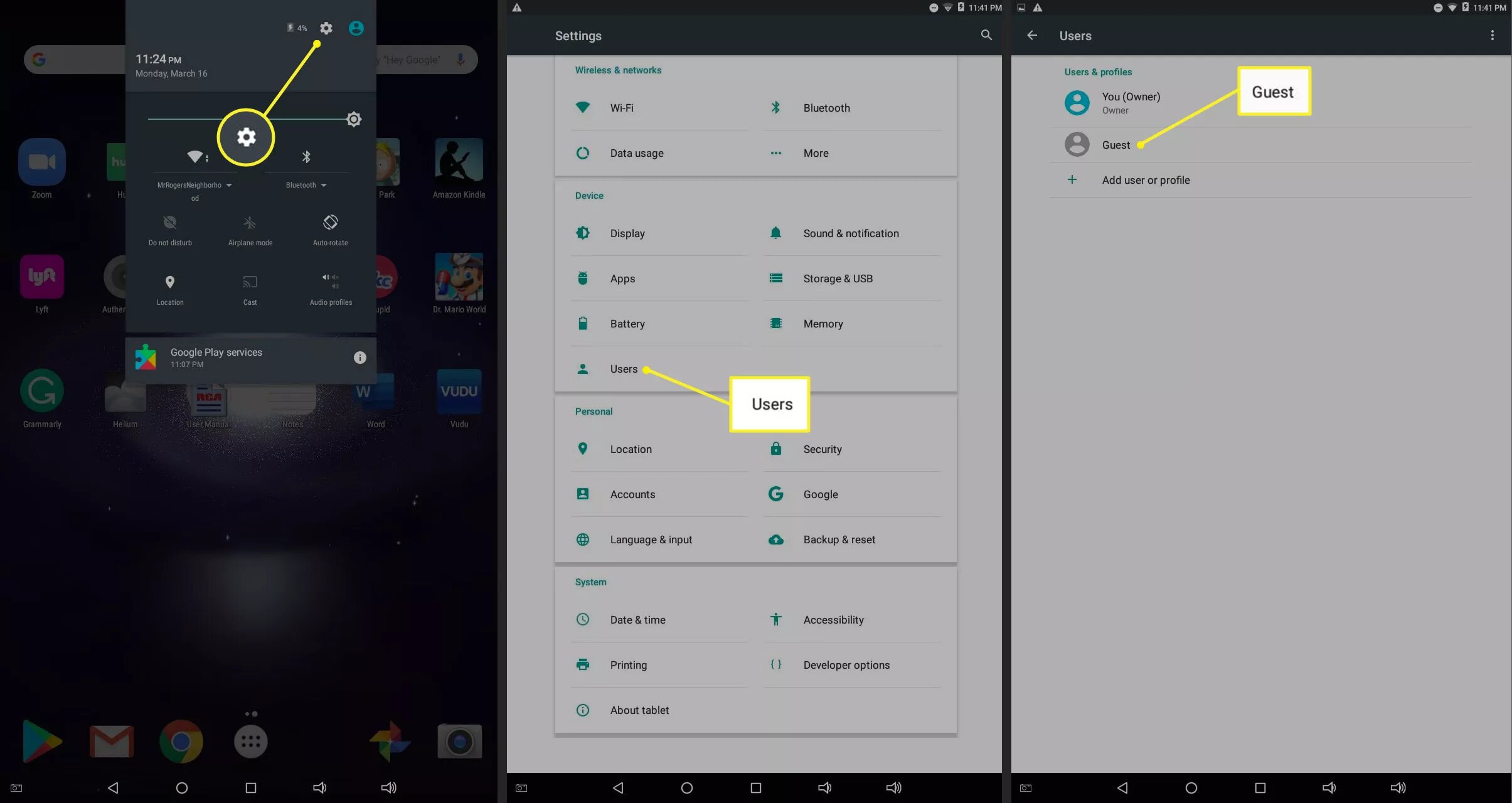 - على هاتفك الأندرويد قم بالدخول إلى تطبيق الإعدادات ثم قم باختيار المستخدمون Users ثم الضيف.
