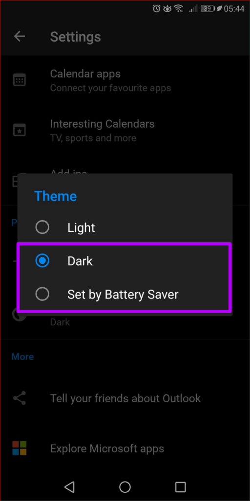 - اختر “Dark ” لتشغيل وضع Outlook المظلم على اندرويد.