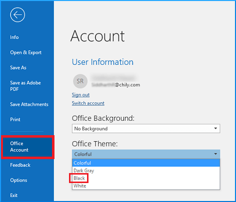 - انقر فوق رمز القائمة المنسدلة لـ Office Theme واختر اسود “Black” من القائمة .