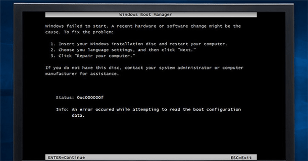 لذلك سوف نريكم كيفية حل مشكلة الخطأ “Error 0xc00000f” علي نظام تشغيل ويندوز 10 في مقالنا اليوم وان رسالة الخطأ “Error 0xc00000f” تظهر بسبب ان هناك تلف في البيانات الخاصة بتثبيت الويندوز .