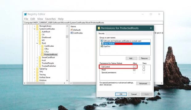 وبعد الذهاب لهذا المسار وقبل الضغط على أي شئ قم بعمل نسخة احتياطية من مفتاح Key root ، ثم بعد ذلك انقر بزر الماوس الأيمن فوق المفتاح ProtectedRoots ، وحدد Permissions من القائمة.