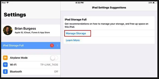 هذا يحدث لك حتى عندما تريد الترقية إلى نسخة حديثه من السوفت وير كمثلا iOS 11، عندما تقوم بفتح الإعدادات أو Settings يمكنك روئية أنه المساحة ممتلئة لأقصى حد لها وسيقوم بكتابة تنبيه بذلك أمامك بشكل واضح على إعتبار أنه تنبيه مهم للغاية وينصحك بإدارة مساحة التخزين بشكل أفضل، ومن ثم قم بالضغط على Manage Storage.