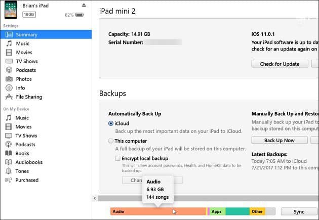 كمثال، iOS 11 يقوم بعرض المساحه المستغله تكون على الوسائط Media و ملفات ال Others، بغض النظر عندما تقوم بتوصيل الجهاز الخاص بك بالكمبيوتر، iTunes يعطي لك تحكم بشكل أفضل في هذه الأمور، بحيث أنه يستعرض لك أغلب المساحه بين جميع الملفات الخاصه به، مثل ملفات الصوتيات وملفات Other بكل سهولة.