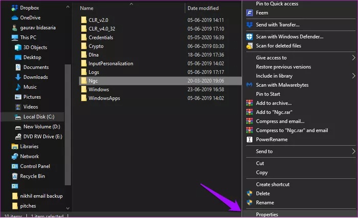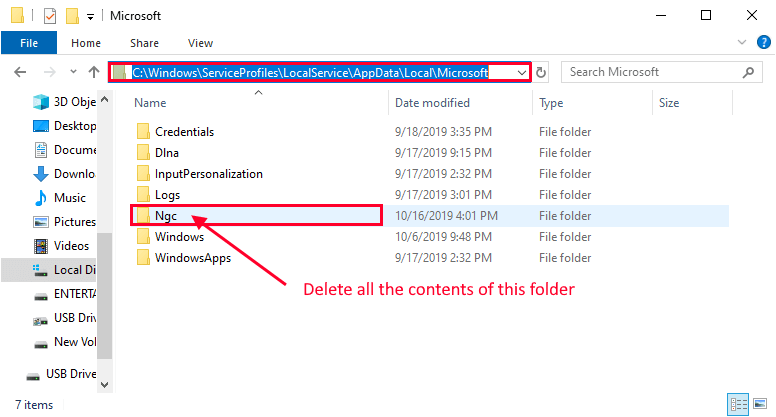 الان يمكنك فتح فولدر NGC و حذف كل ما بداخله لتتمكن من انشاء رمز تعريف شخصي جديد من اجل تسجيل الدخول الى ويندوز 10 بسهولة .