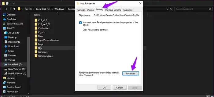 • قم بالضغط على الفولدر من اجل الدخول و مسح جميع الملفات بداخله و اذا لم تتمكن من ذلك انقر بزر الماوس الأيمن لتحديد خصائص “Properties ”  و اختر خيارات متقدمة “Advanced ”  ضمن علامة التبويب الأمان “Security”