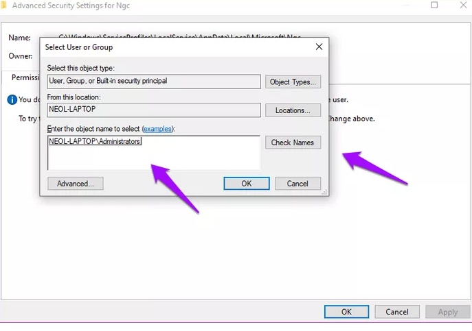 • اضغط على التحقق من الاسماء “Check names” و من ثم OK