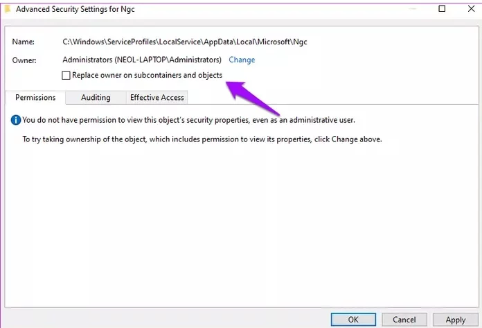 • اضغط على المربع بجانب Replace owner on subcontainers and objects ثم اضغط OK