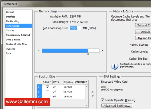 من ضمن تلك المشكلات التى قد تواجهك فى الفوتوشوب هى مشكله “Scratch Disk Is Full” و هى تعنى ان البرنامج يحتاج الى مساحه اكبر من الرام ميمورى الخاصه بجهازك لذلك تظهر لك تلك الرساله مرات عديده لان النظام يقوم بشكل تلقائى باعطاء البرنامج جزء مخصص من الرام .