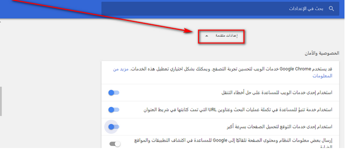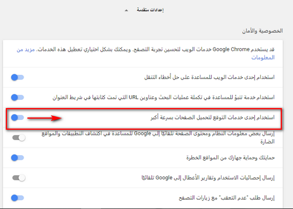 واختر خواص الخصوصية والأمان ومنها اختر استخدام إحدى خدمات التوقع لتحميل الصفحات بسرعة أكبر، فإذا كانت مفعلة قم بإلغاء التفعيل.