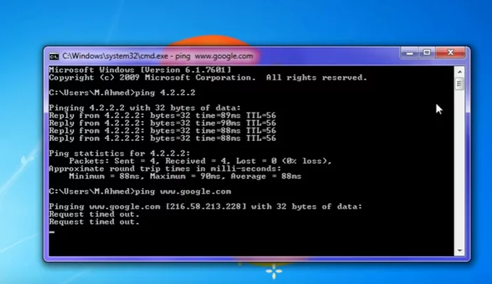 نقوم بالضغط على قائمة start ونكتب cmd  ثم نضغط enter، سوف تفتح قائمة الـ cmd نكتب بها ping 4.2.2.2  ثم نضغط enter وننتظر قليلًا وعندما يكمل تحميل نكتب ping www.google.com  ونضغط enter.