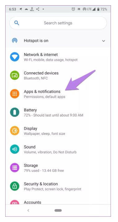 - قم بفتح الاعدادات “Settings” على الاندرويد خاصتك و اختر من القائمه التطبيقات و الاشعارات “Apps & Notifications” .