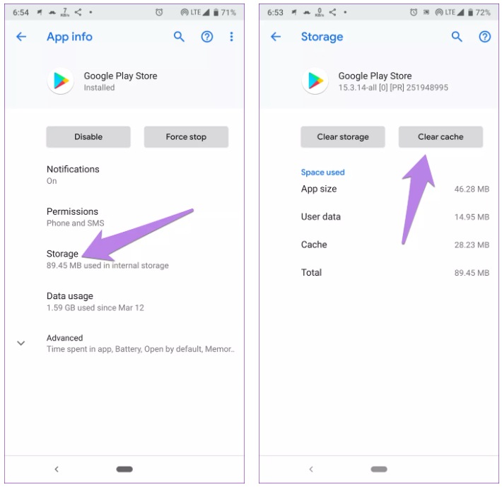 - قم بالضغط على حذف الذاكرة المؤقته “Clear Cache” اولا و تحقق من التحديثات على المتجر و اذا لم يتم حل المشكله عد مره اخرى و اختر حذف البيانات “Clear storage”