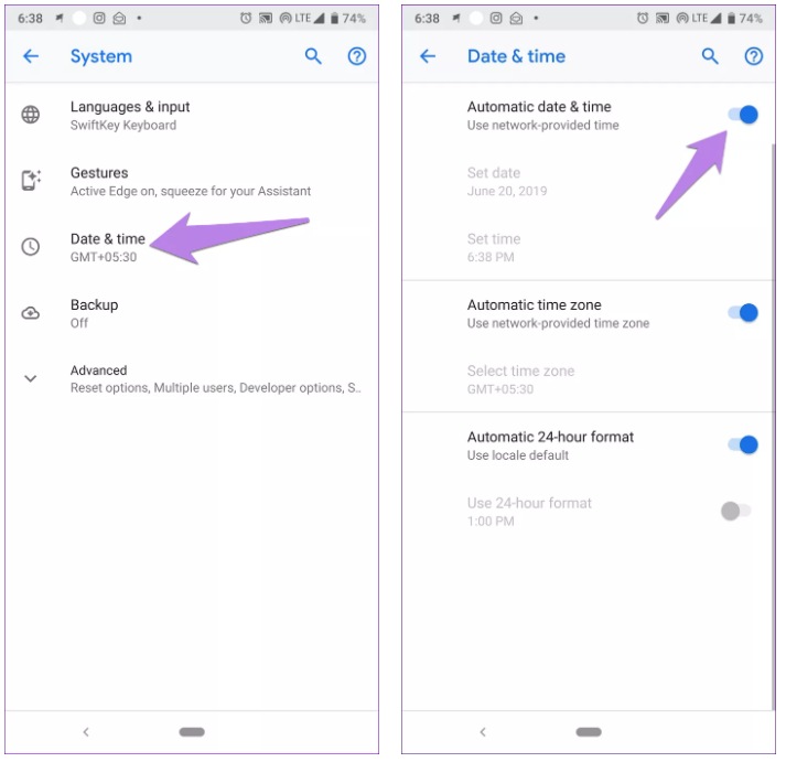 - قم بتمكين الضبط التلقائي للوقت و التاريخ من خلال تحريك الايقونه الى اليمين.