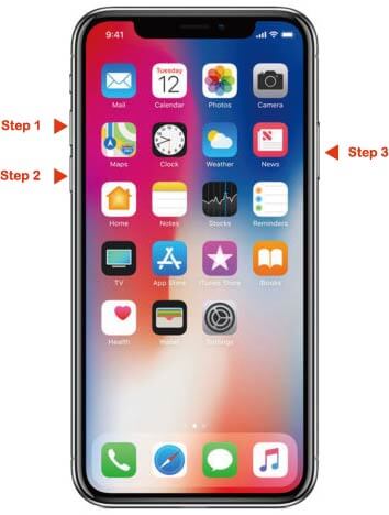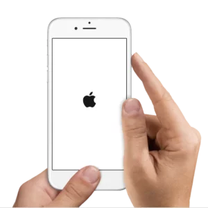 - قم بالضغط عل كل من زر هوم و زر الطاقه معا في نفس الوقت حتى يظهر لك شعار ابل و في ايفون 7 اضغط باستمرار على زر خفض الصوت و زر الطاقه معا .