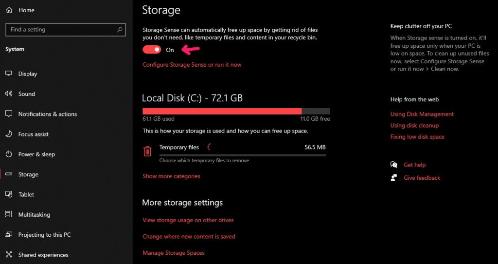 توفر الميزة الادوات اللازمه لحذف ملفات الذاكرة المؤقته و يمكنك استخدامها بسهولة من اجل تفريغ مساحة في محرك الأقراص الخاص بك و يمكنك ضبطه بحيث يقوم ويندوز 10 تلقائيًا بحذف الملفات المؤقتة غير المستخدمة ، وكذلك الملفات التي كانت موجودة في فولدر سلة المحذوفات و التنزيلات لأكثر من يوم أو حتى 60 يومًا.